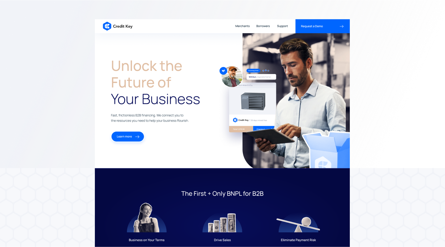 while Credit Key offered leading-edge business payment solutions, its lack of brand awareness left the company struggling to stand out in the marketplace and among its core audiences — merchants and borrowers. To strengthen the brand’s positioning and bolster its reputation, we infused Credit Key’s visual and verbal identity with personality and created brand guidelines for consistent application.